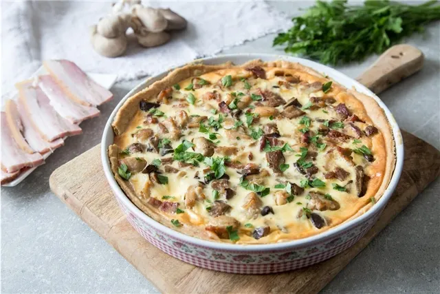 Пирог с грибами — классическое русское блюдо с сочной грибной начинкой в сливочно-сырном соусе и хрустящим нежным тестом.