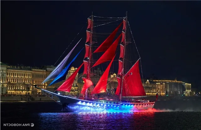 Традиционный праздник выпускников "Алые паруса" в Санкт-Петербурге завершится парадом брига "Россия" с алыми парусами на Неве после полуночи.
