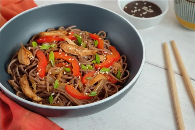 Гречневая лапша по-японски с курицей и овощами — вкусное и полезное блюдо с насыщенным вкусом и простым приготовлением.